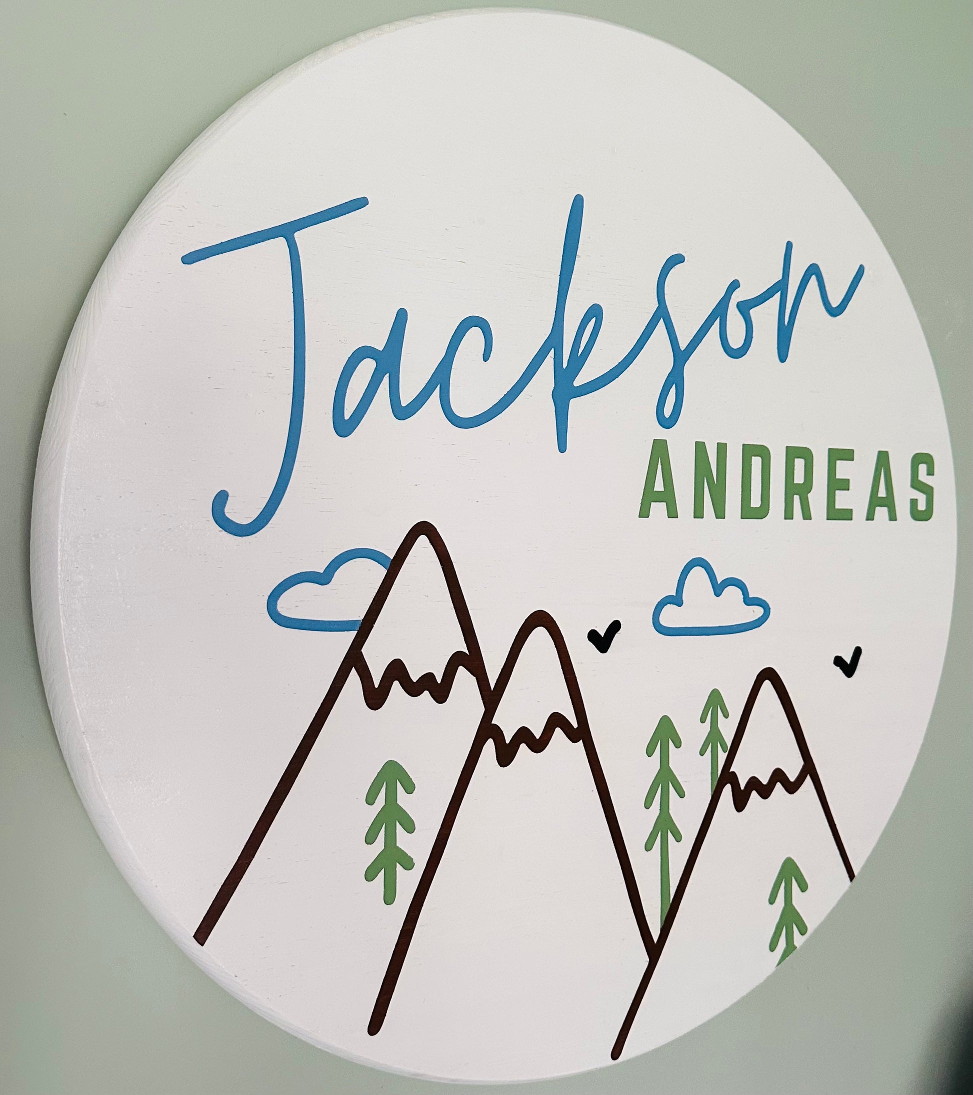 Personalized baby boy room mountain / forest theme white wood sign. Completely hand painted. 15" and 18" options available. Sealed for indoor durability.