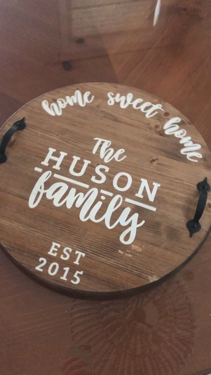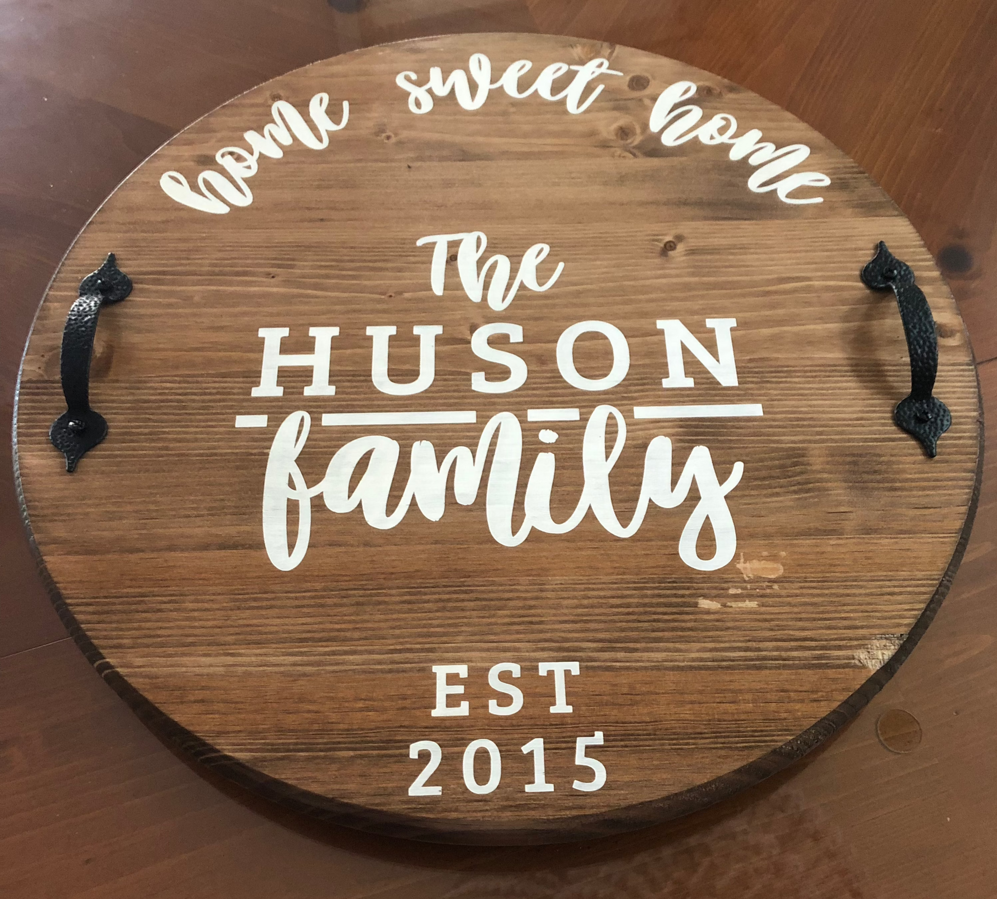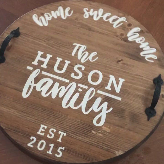 Personalized Home Sweet Home, family name and est. date lazy susan. Completely hand painted. Handles or no handles options available. Stained with Special Walnut stain. Water resistant (wipe clean with mild soap and water).